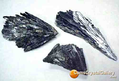 Each piece of Kyanite is similar to the ones pictured. Kyanite is a polymorph with two other minerals; andalusite and sillimanite. A polymorph is a mineral that shares the same chemistry but a different crystal structure with another, or other, minerals. Kyanite is an attractive mineral that is found in different colors. This is Black Kyanite and overall shape is slightly different from the Blue Kyanite. Kyanite has a unique characteristic in that it has a wide variation in hardness, in the same crystal. The hardness of kyanite is approximately 4.5 when scratched parallel to the long axis of the crystal and approximately 6.5 when scratched perpendicular to or across the long axis. Other minerals usually have variable hardness on different crystal faces due to a different concentration and oreintation of the atoms in the structure.
