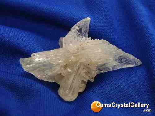 This is a nice little piece of clear Gypsum, also known as Selenite. It is a cluster in a crucifix-type shape with smaller crystals coming out of the contact points of the larger crystals. There is no visible contact damage, but there is some very light microdamage on a couple of the crystals.