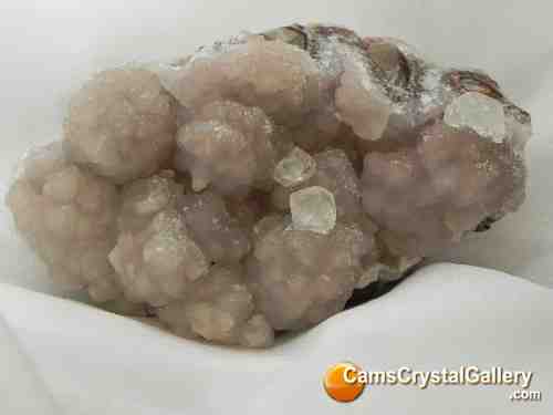 These are some showy pieces with the pink chalcedony forming on dog tooth calcites. Then some beautiful clear calcite rhombohedrons forming on the chalcedony. The calcite fluoresces red-orange under UV light and is very pretty