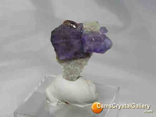 A thumbnail that has great display. This classic local specimen sits on a plate of quartz and has perfect purple fluorite cubes and a small sphalerite sitting on top. An extremely nice thumbnail to have.