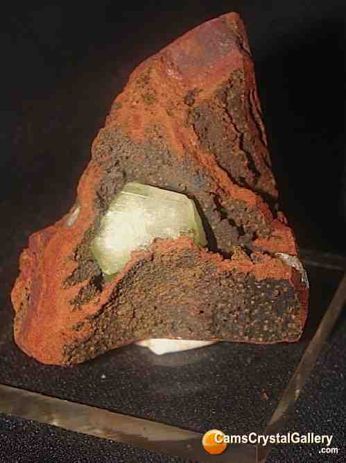 This adamite is very pristine. It is a single crystal that is astecically set in a ridge of limonite. The adamite crystal is 1.5 x 1 cm in size. It is undamaged and fluoresces well under long wave UV. It has a sawn bottom that allows it to sit independent.
