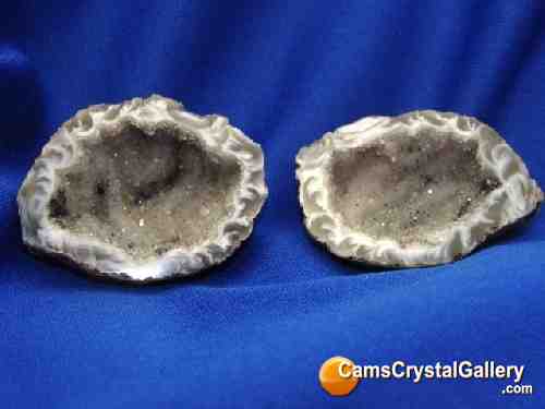 This specimen is sold as a pair, not single halves. The measurements are for one half of the geode. This auction is for a complete Agate Pot pair.Inside of the Agate Pot there are is a large (for the piece) cluster of tiny Quartz points with inclusions. Both halves are in perfect condition. It is a great display pair.